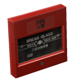 A Fire alarm is a wall-attached block, replicating the fire alarm initiating devices seen in Hong Kong.